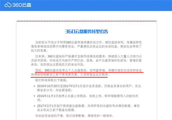 根據(jù)360官方微博公告來說,360云盤決定停止個人云盤服務(wù),在網(wǎng)盤存儲、傳播內(nèi)容的合法性和安全性得到徹底解決之前,不再考慮恢復(fù),之后轉(zhuǎn)型企業(yè)云服務(wù)。根據(jù)通告,360還將會退還繳費用戶的相關(guān)費用。