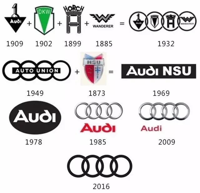 奧迪的四環(huán)標志如今可謂是深得人心,但是這簡單的四個環(huán)形演變過程也不容易,1885年至1909年的四個標志分別代表著當時的四個汽車品牌,1932年的logo標志著這四個汽車品牌的合并,并在1949年將四環(huán)標志沿用至今。四環(huán)標志的在之后的演變也如谷歌一般從有光澤的立體化演變?yōu)楝F(xiàn)今全黑樣式的扁平化。